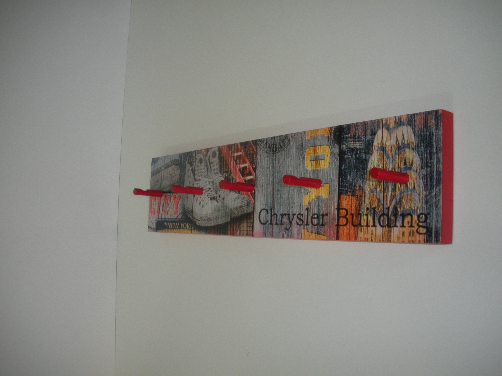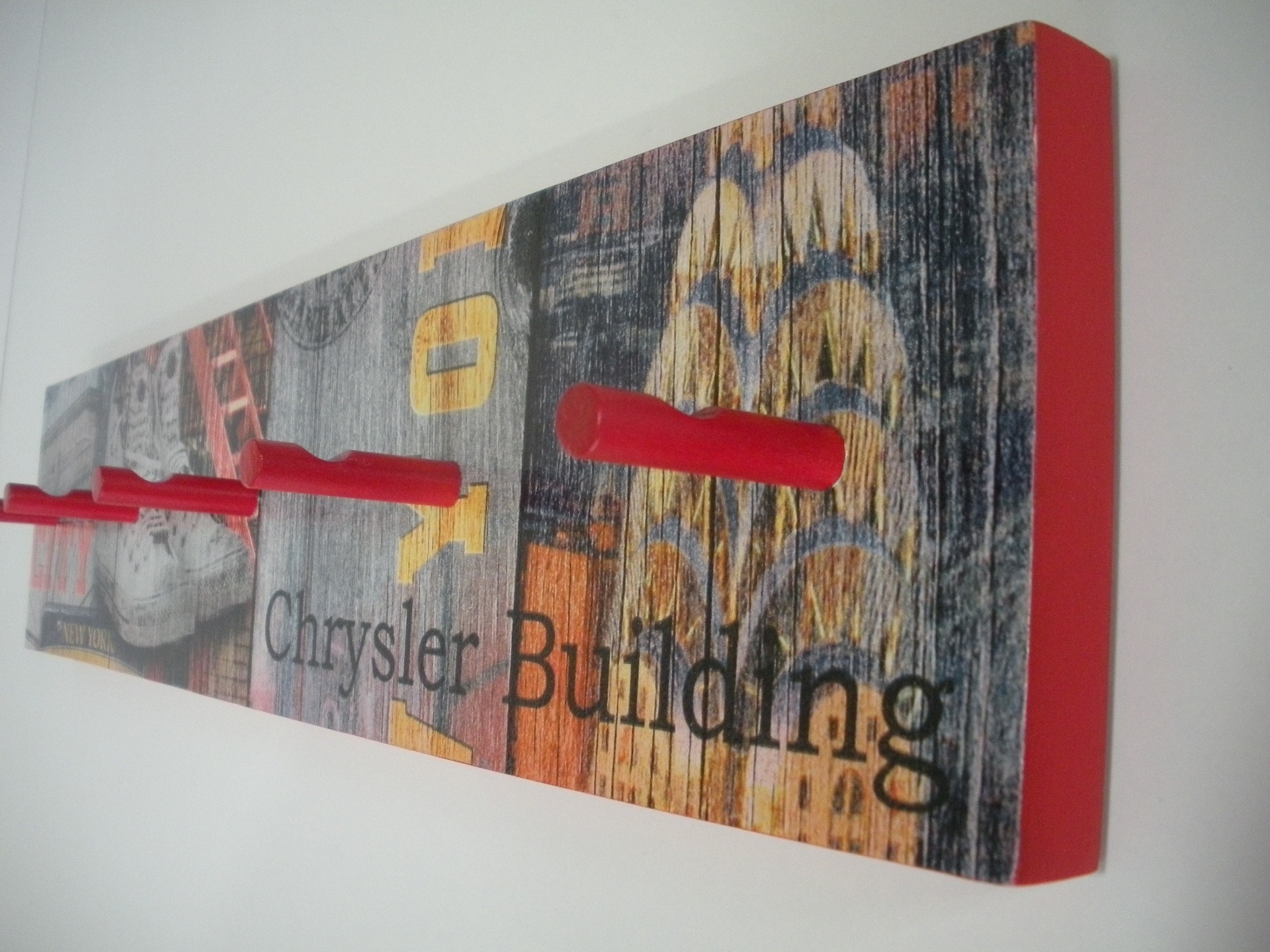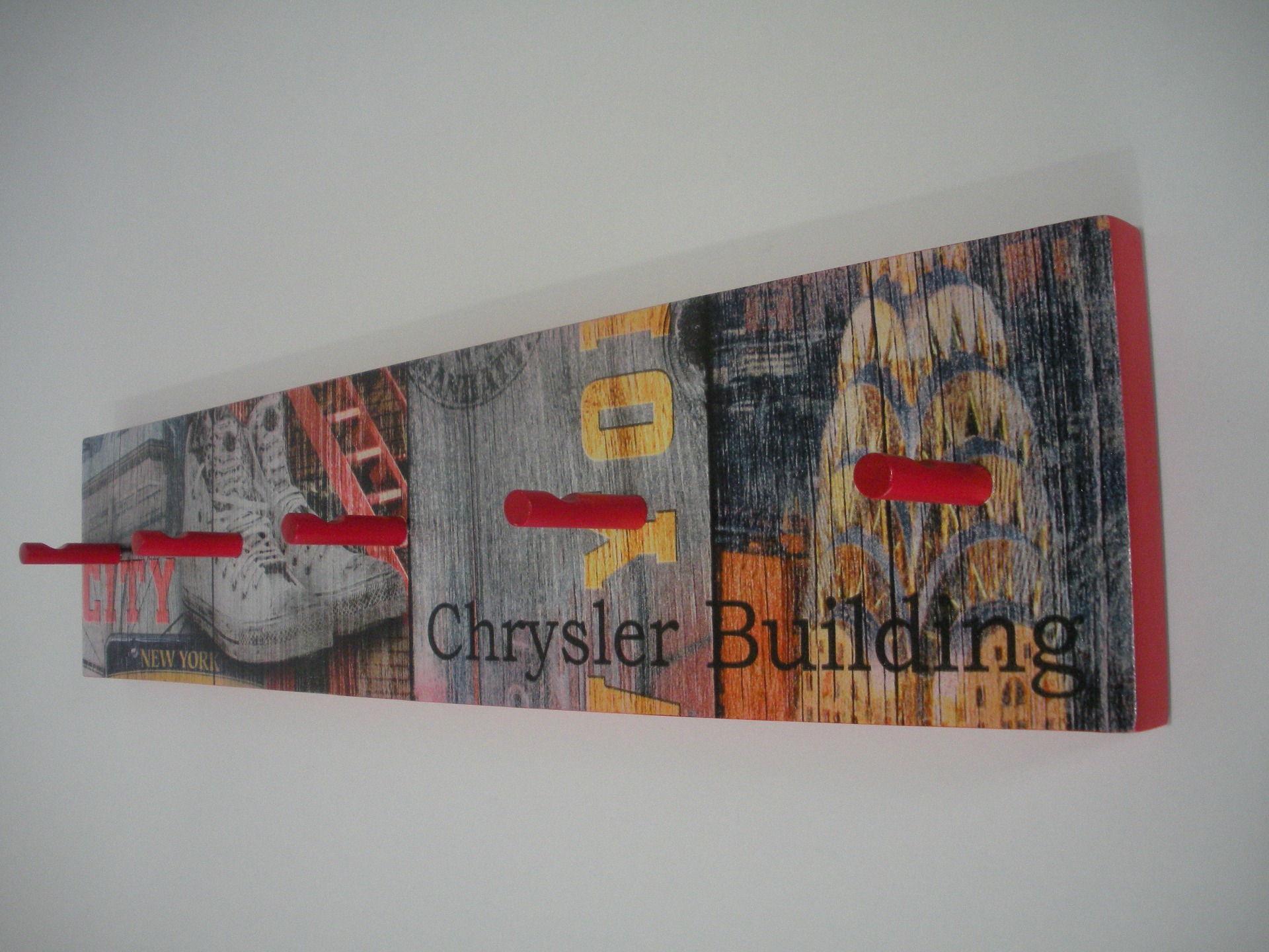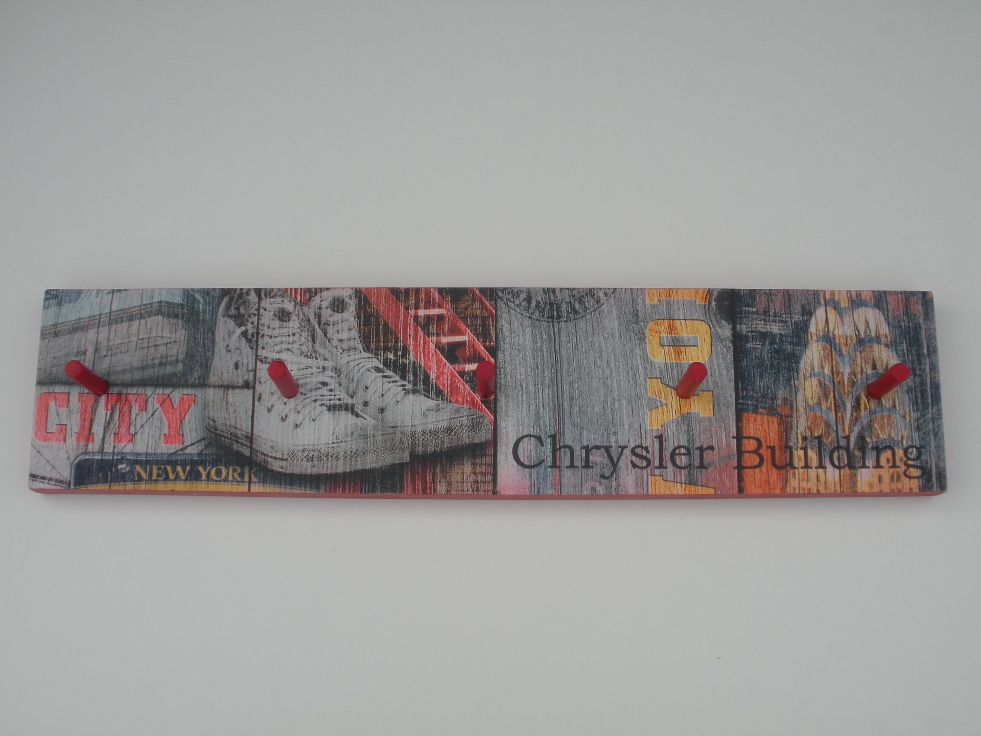 Cabide parede com pelicula, Bordos pintados em vermelho com 5 pinos. Dimensão: 52,5x12 cm.