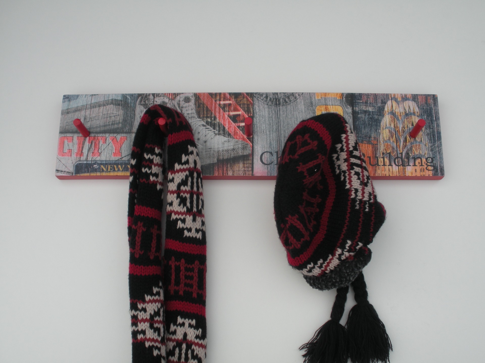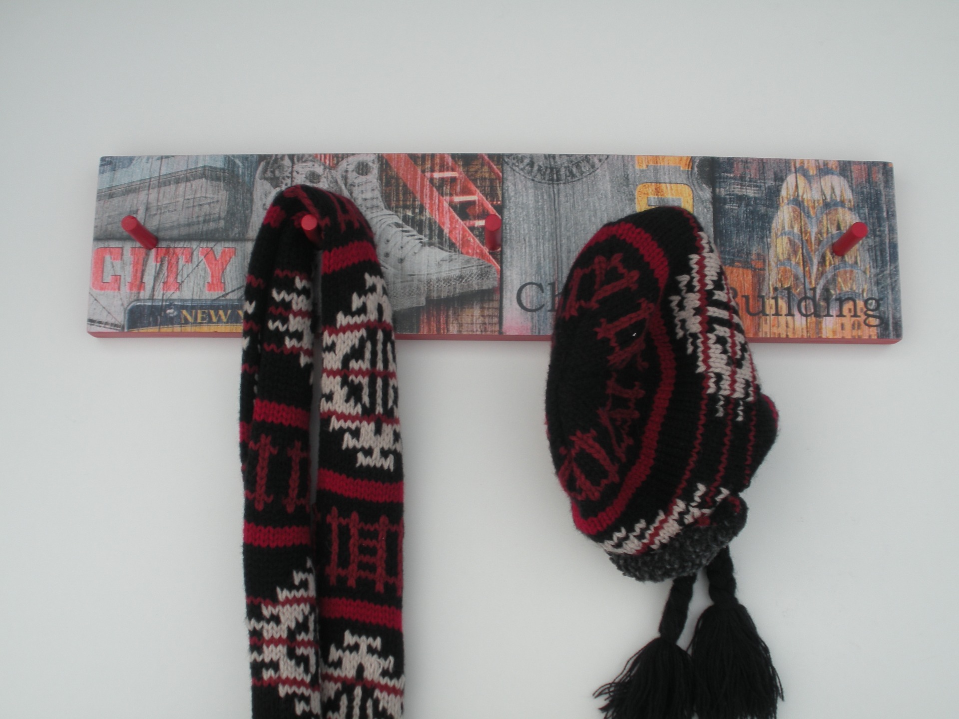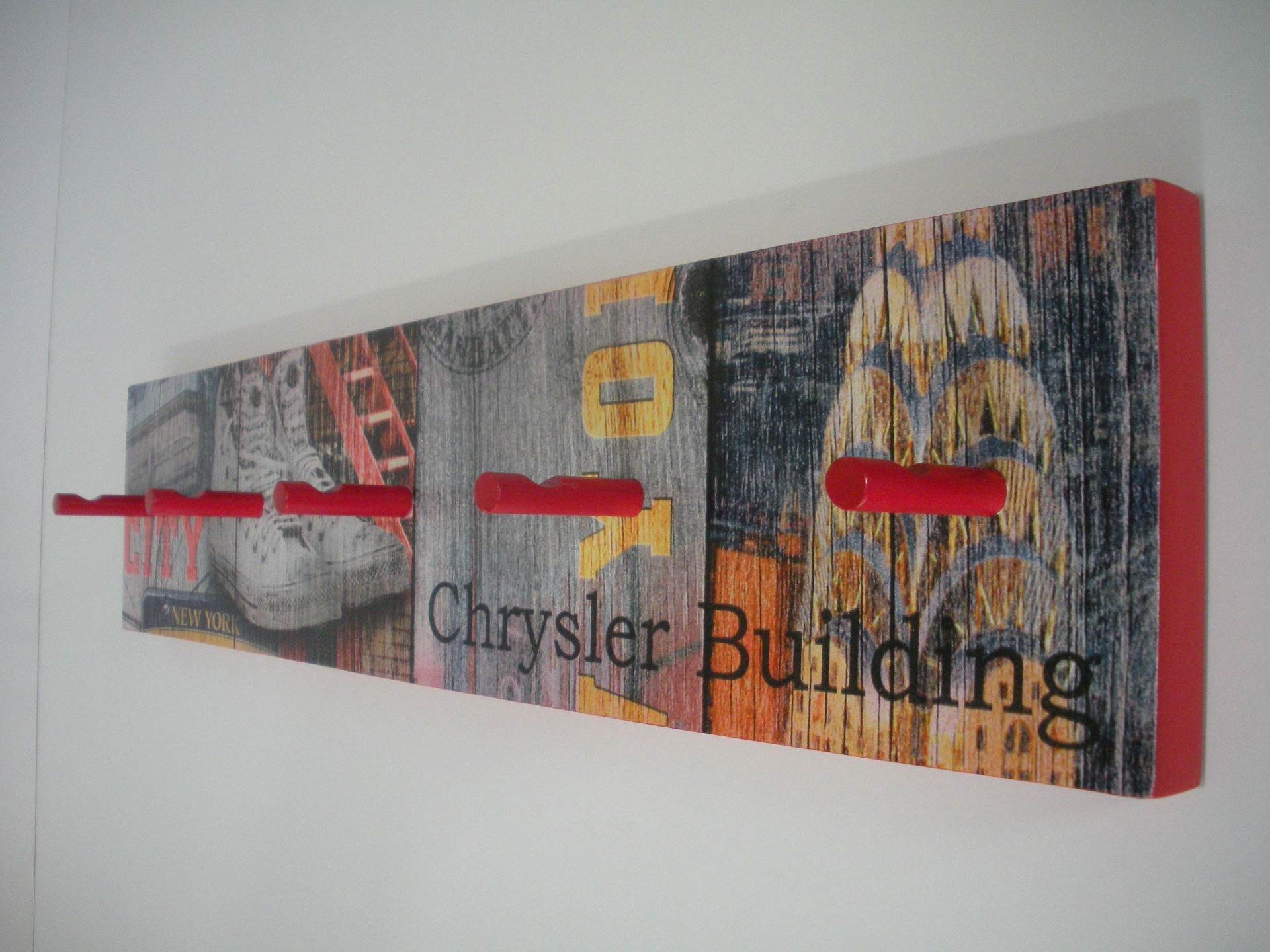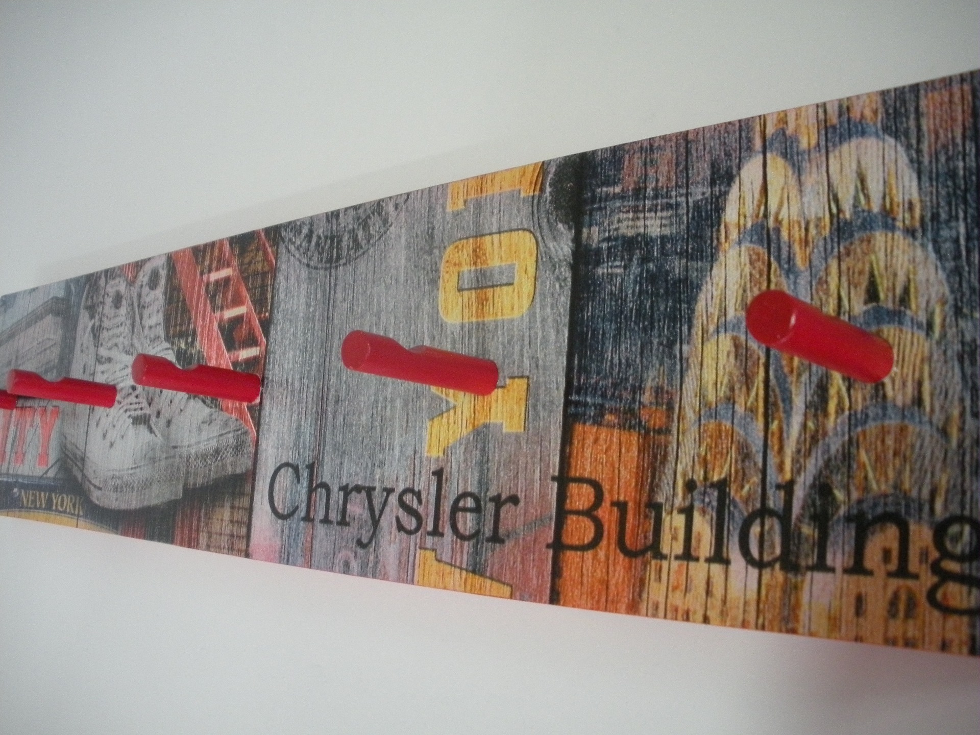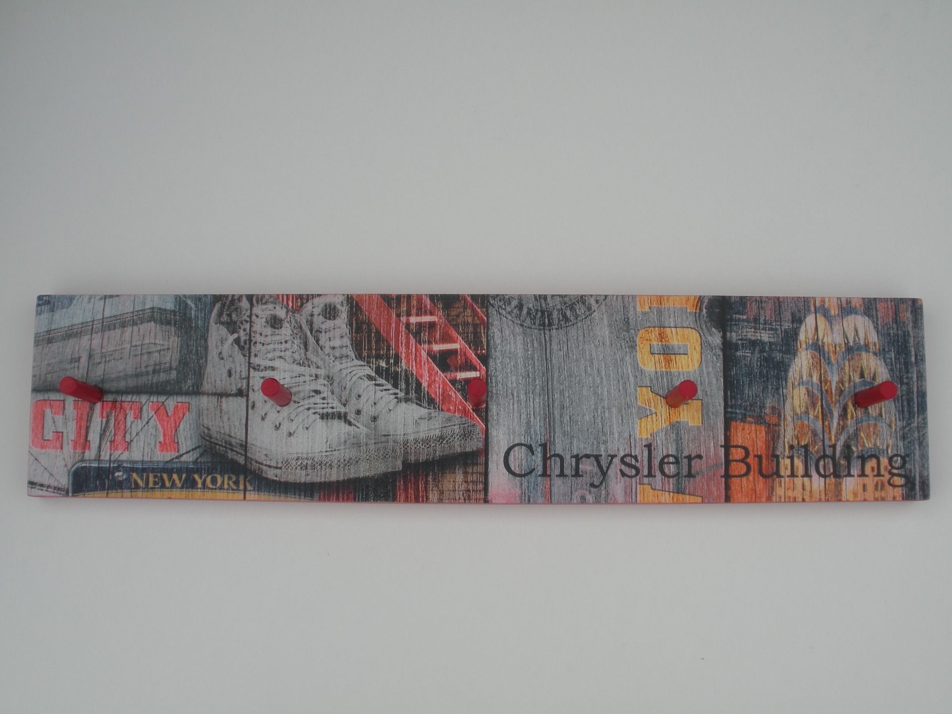 Cabide parede com pelicula, Bordos pintados em vermelho com 5 pinos. Dimensão: 52,5x12 cm.