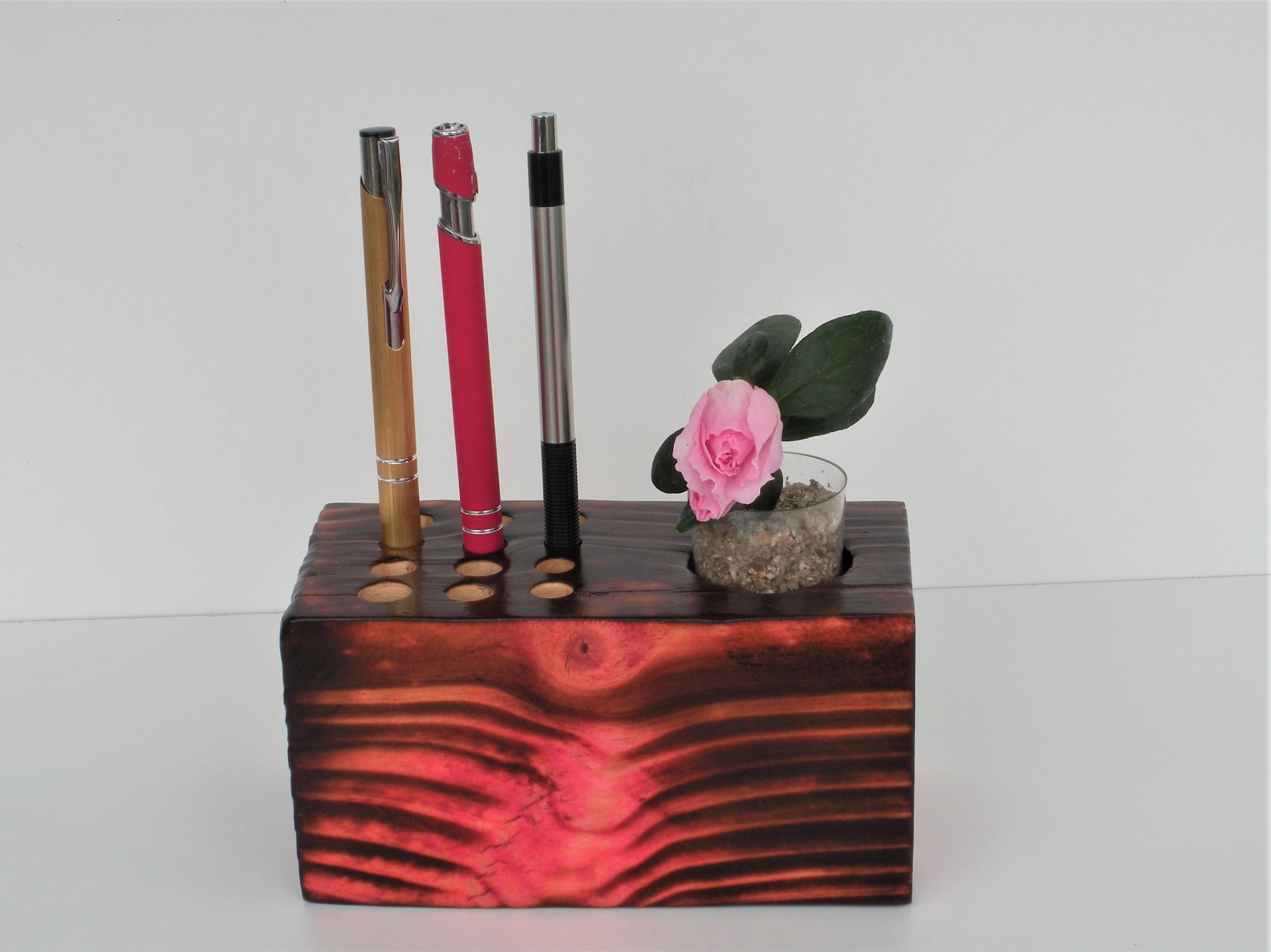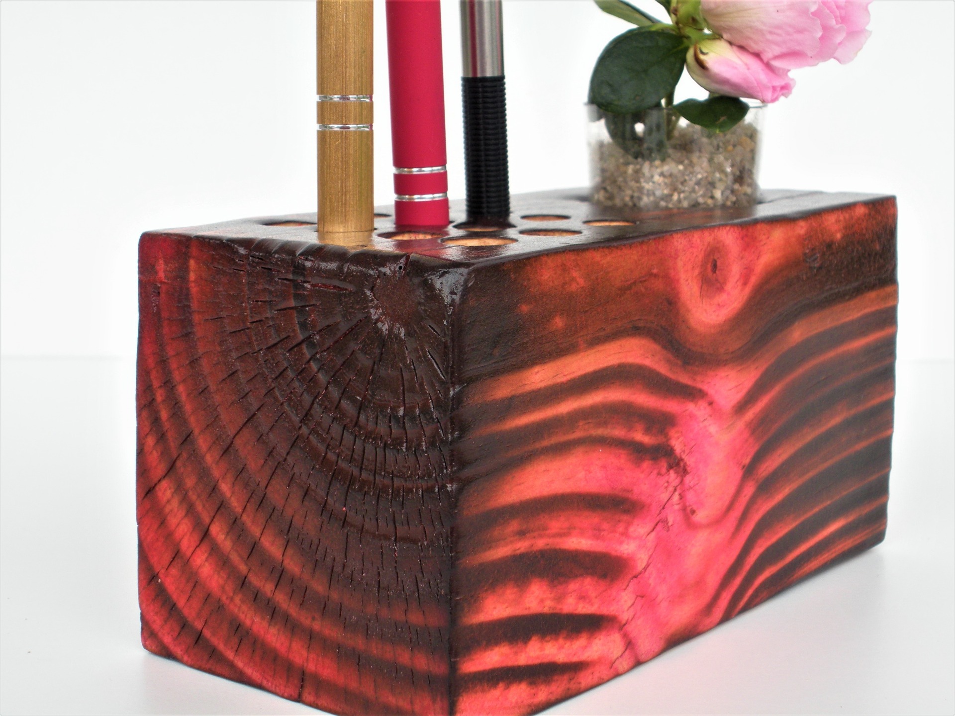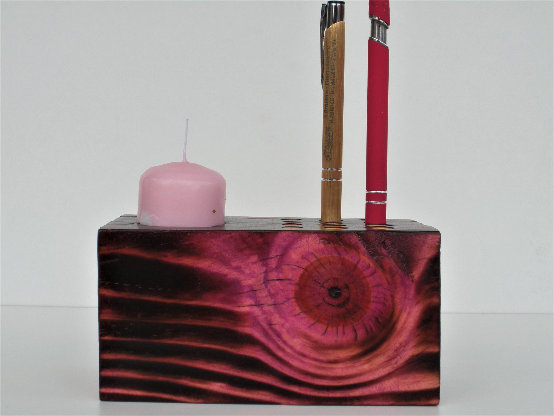 Suporte de lápis em madeira colorida com relevo e acabamento em verniz. Dimensão 8x8x15 cm.